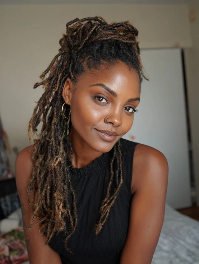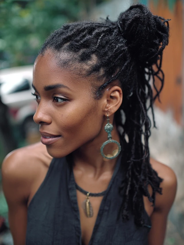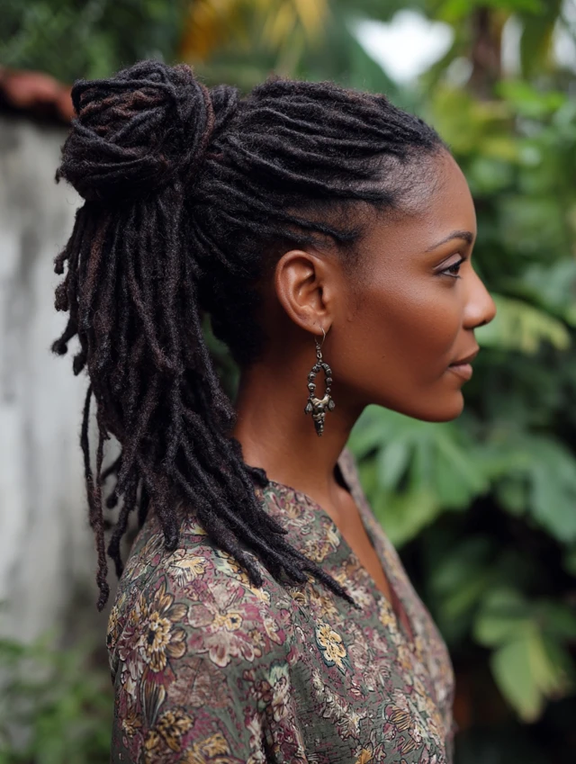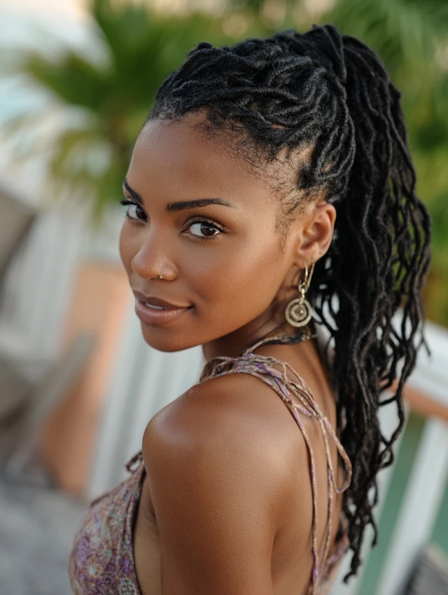 A mid or low ponytail keeps locs controlled yet relaxed. It suits most face shapes because placement can adjust balance. Thin locs create a sleek finish without bulk.