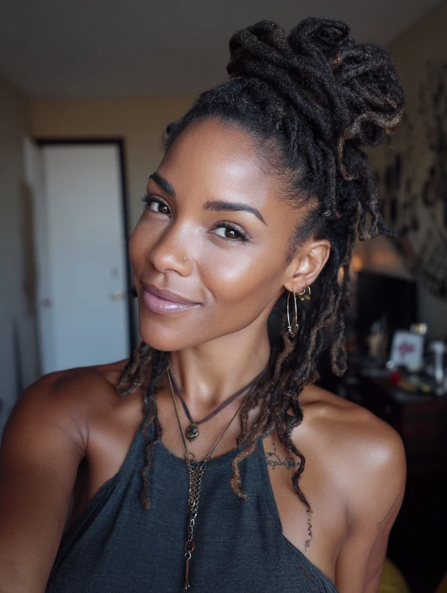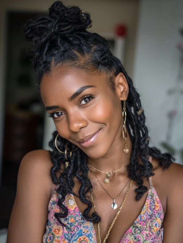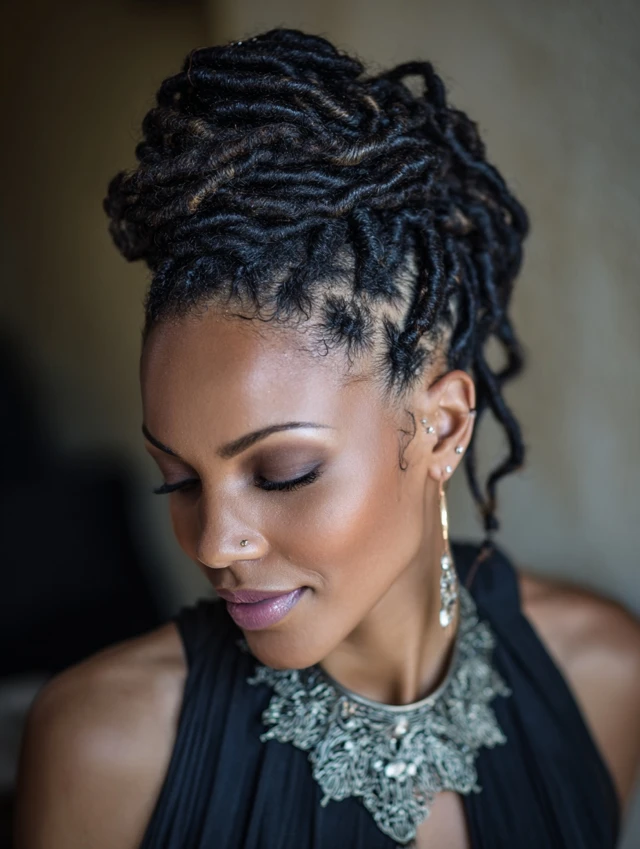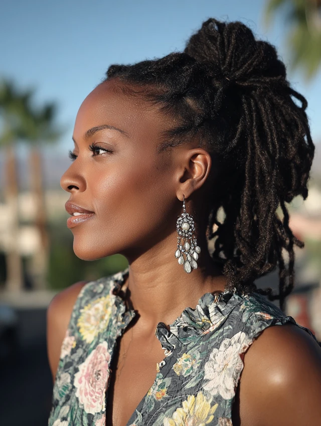 Secure loosely to avoid tension. Let a few locs fall naturally around the face. This look works for daily wear and social events. Styling takes minutes and stays secure all day.