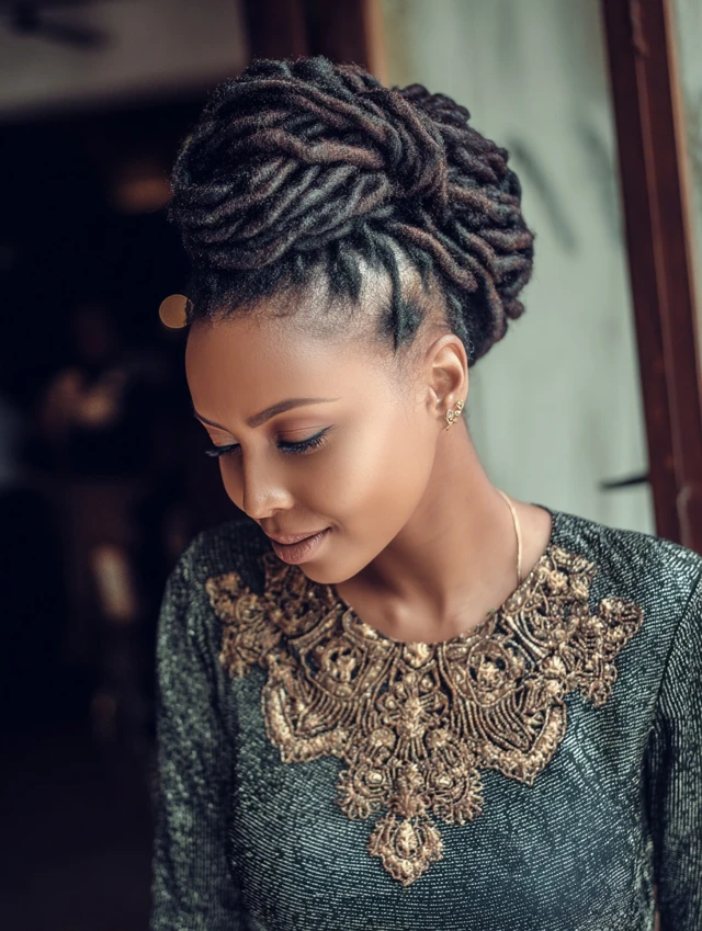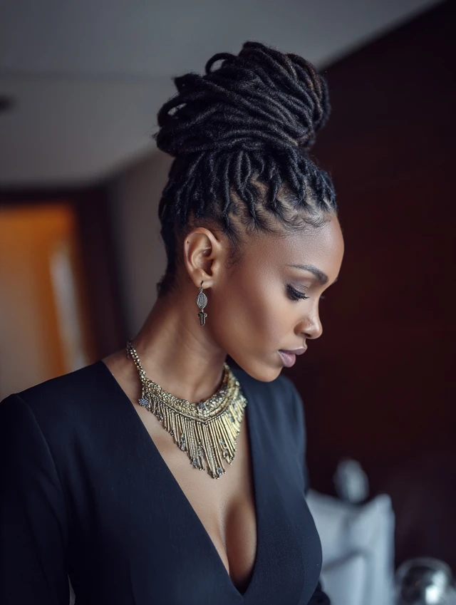 Gather locs gently and secure with a soft band. Tuck ends neatly for structure. This style works for professional settings and formal events. It protects ends while keeping the look refined.