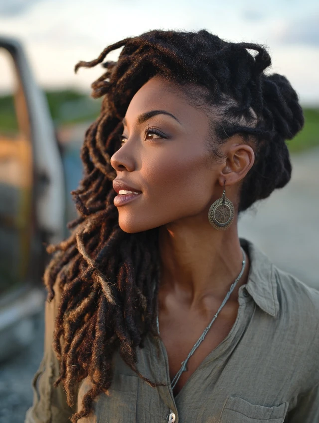 A half-up style lifts the top section while keeping length visible. It suits round and petite faces because it adds height. Thin locs make the gathered section look full without heaviness.