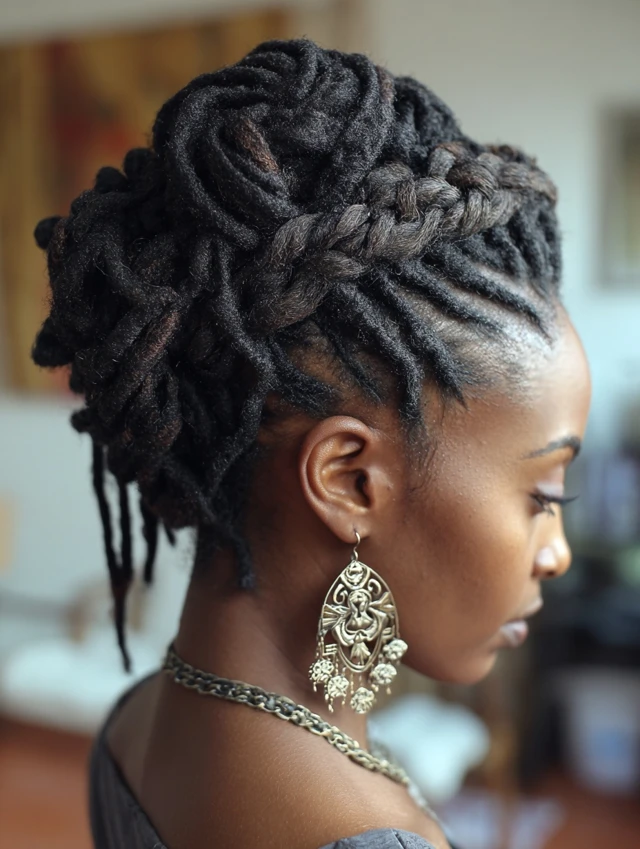 A crown braid made from thin locs creates elegance. It suits round and long faces by adding width around the head. Smaller locs allow detailed braiding without heaviness.