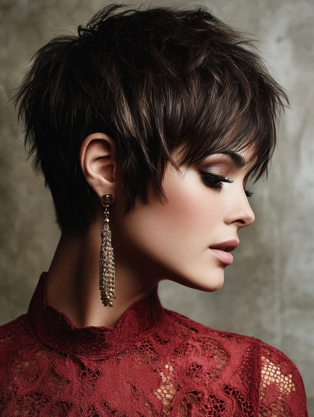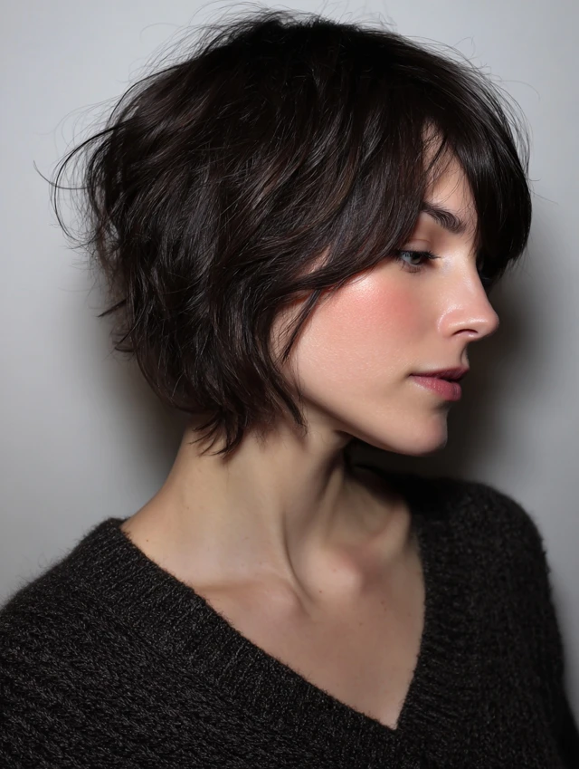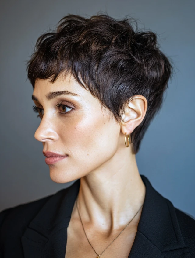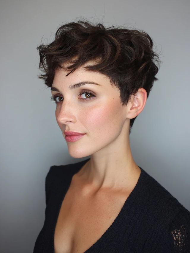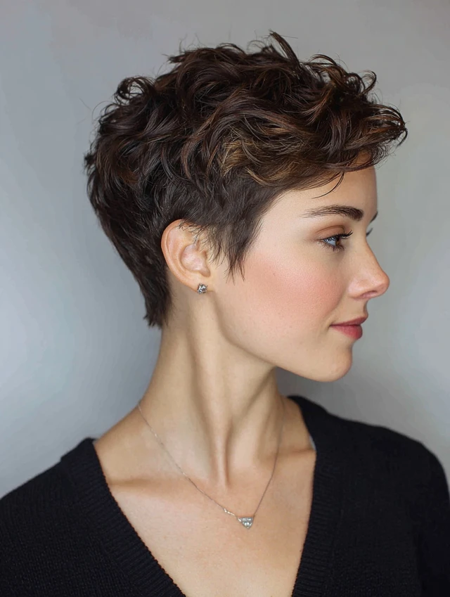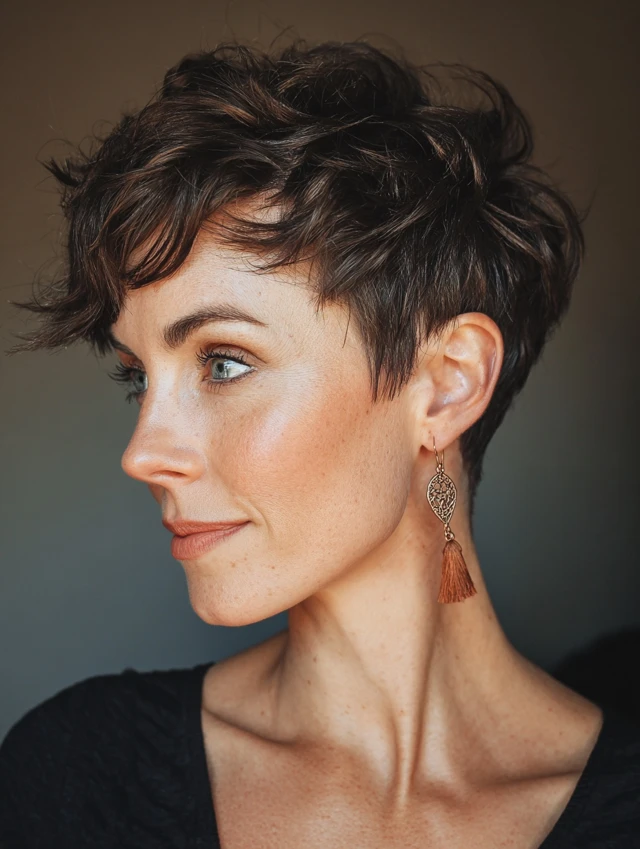 The textured pixie suits fine to medium hair and oval, square, or heart-shaped faces. Choppy layers create natural movement and volume. Side-swept bangs can soften the forehead and enhance features. It’s perfect for women who want a chic, fuss-free look.