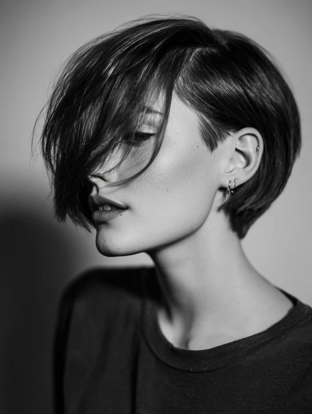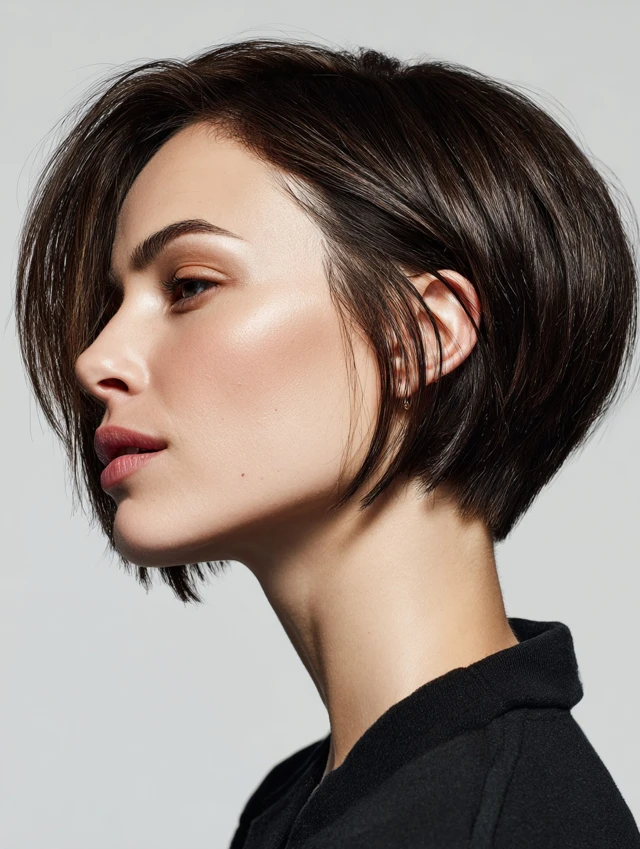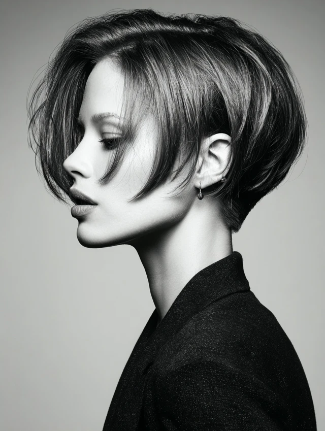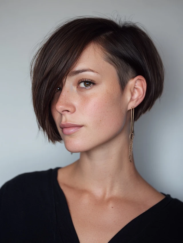 A jaw-length bob with a more pronounced undercut creates a bold, edgy look. Suits oval and heart-shaped faces and straight or slightly wavy hair. Fine to medium hair holds the structure well.