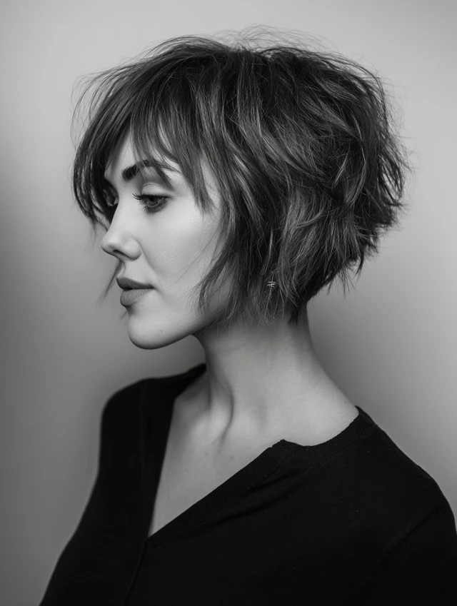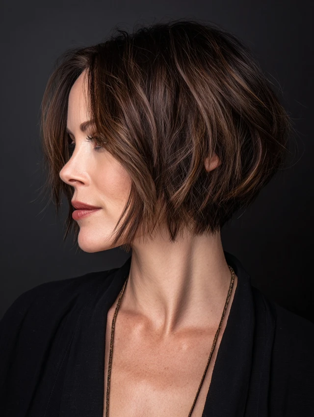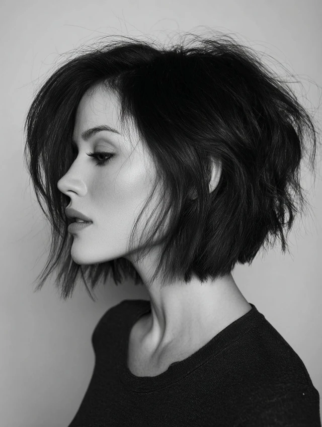 Adds choppy layers to the bob while keeping the undercut, creating movement and volume. Best for oval, heart, and square faces. Medium-thick hair shows texture clearly.