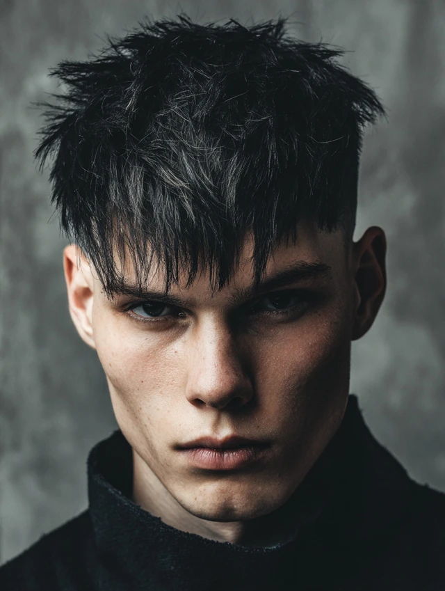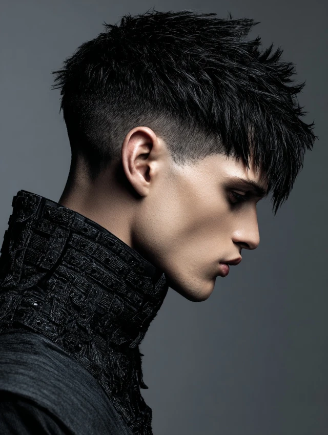A textured crop paired with a clean fade blends modern and gothic. It suits round and oval faces by adding structure.