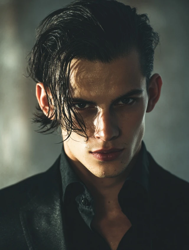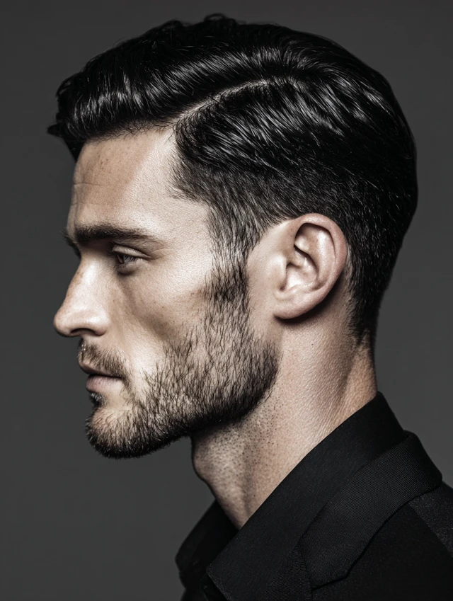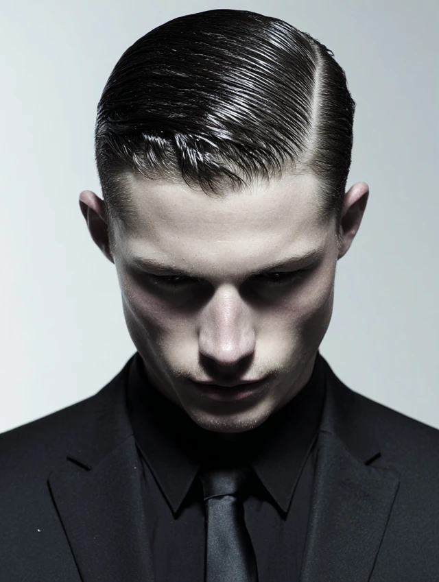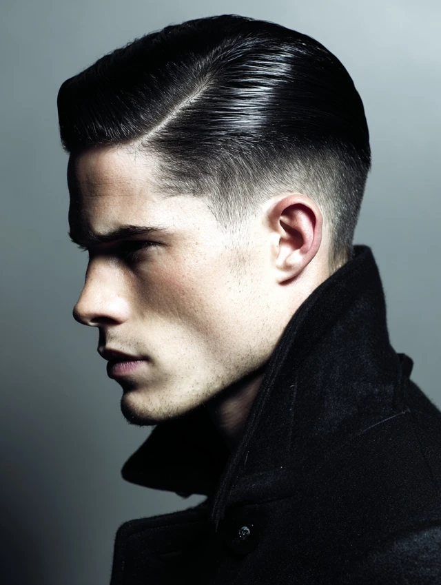 Apply lightweight pomade and comb evenly backward. Keep the sides neat for contrast. This look fits formal evenings and gothic-inspired fashion.