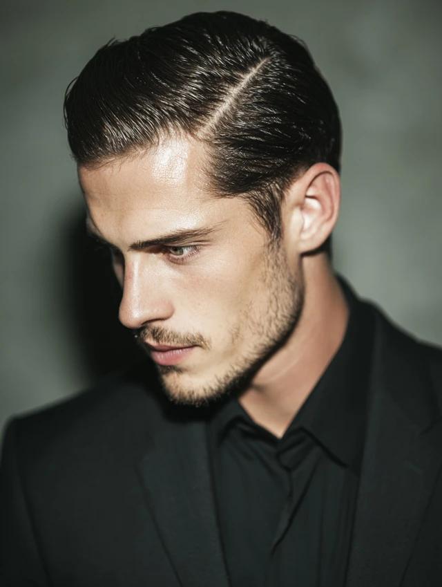 Slicked-back hair creates a clean, intense look. It suits oval and angular faces by highlighting the jawline. Medium-length hair works best for this style.