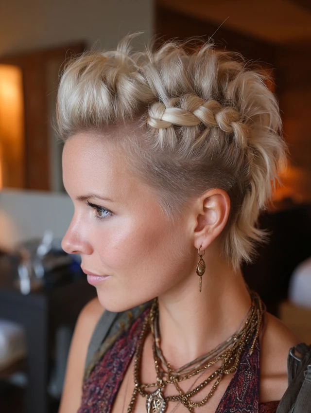 This version uses tight side braids that feed into a raised center section. It suits oval and long faces by adding width. Medium to thick hair holds the shape best. The faux hawk gives warrior energy without shaving fully.