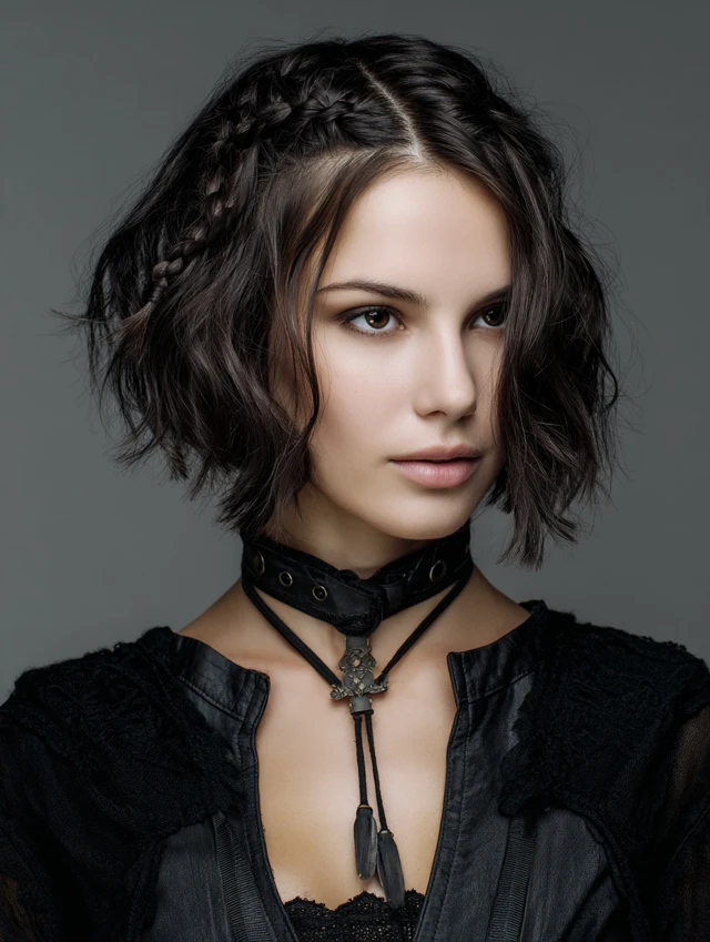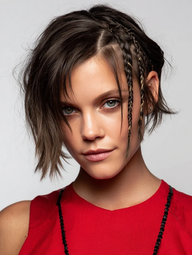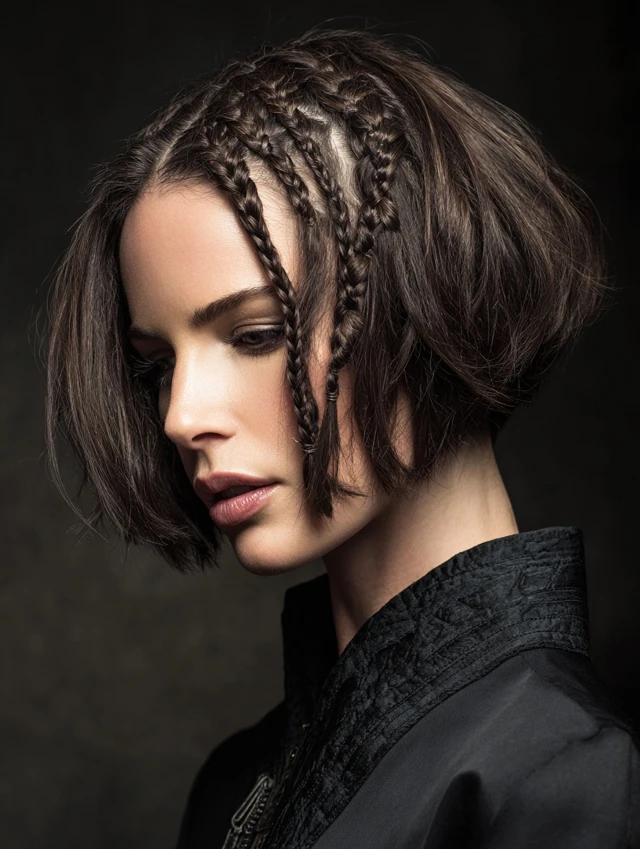 A chin-length bob with tight side braids blends structure and softness. It flatters square and round faces by balancing width. Fine to medium hair works well here. The braids add texture without removing fullness.