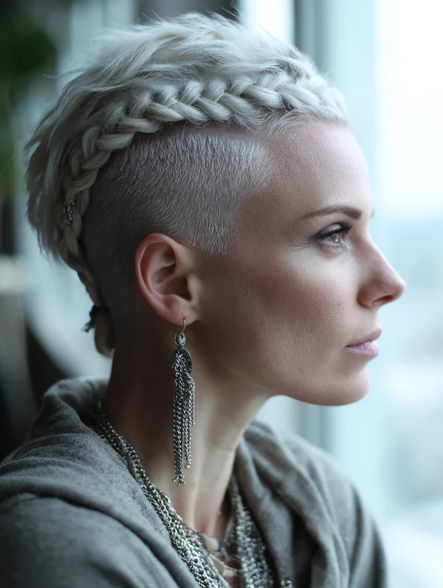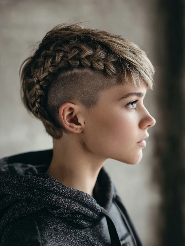 A short layered cut with scattered micro braids feels subtle yet strong. It suits most face shapes because the layers soften the look. Fine hair gains texture without heavy shaving.