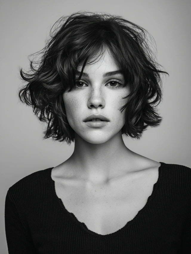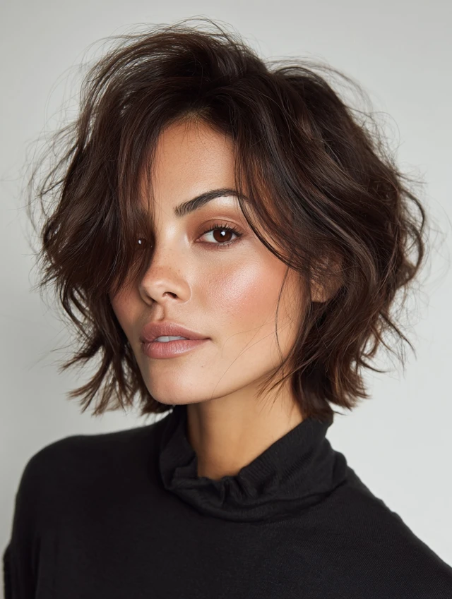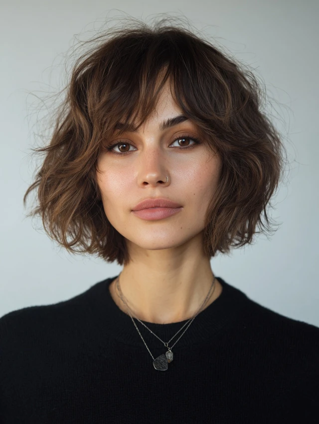 This cut sits around the jaw or neck with choppy layers and natural waves. It suits oval and heart-shaped faces best. Shorter length keeps waves bouncy and prevents heaviness.