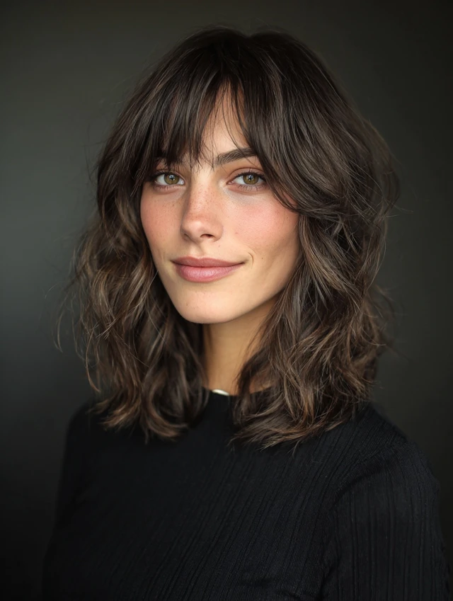 Curtain bangs blend into wavy layers, softening the face and drawing attention to the eyes. This style flatters oval, heart, and round faces. Waves help the bangs fall naturally instead of looking stiff.