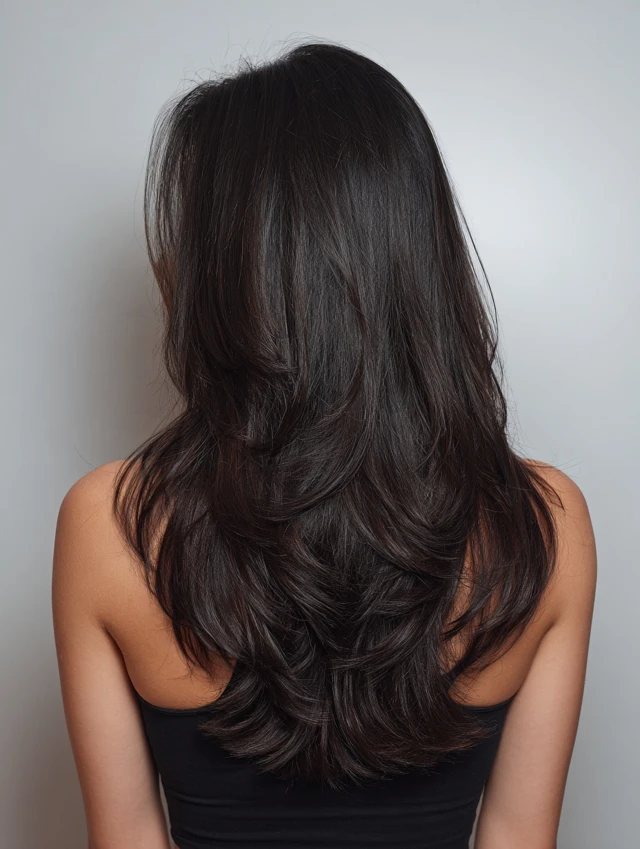This version keeps balanced layers at the crown with tapered, wavy ends. It works well for oval, heart, and round faces. Natural waves give the cut movement without extra styling. Medium-density hair shows the layered shape clearly.