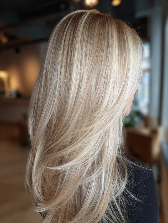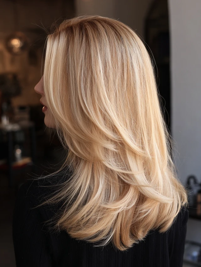 Champagne tones add softness without going dull. A shadow root adds depth near the scalp. This style suits long and oval faces because it elongates the silhouette.